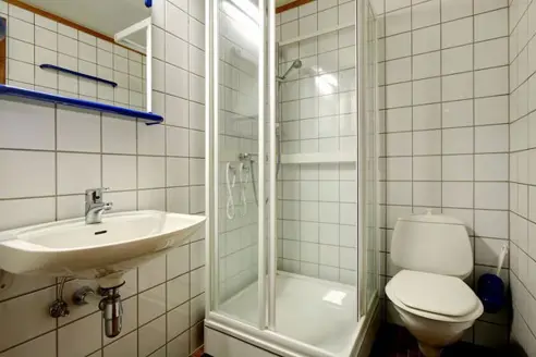 Lejlighed til max 8 personer: Disse lejligheder er ca. 85 kvm. med tre soverum og en hems. 1 værelse med dobbeltseng og to værelser med en køjeseng. I lejligheden er der to badeværelser med bruser og WC. Køkkenet er godt udstyret med opvaskemaskine, komfur og køleskab med fryser.