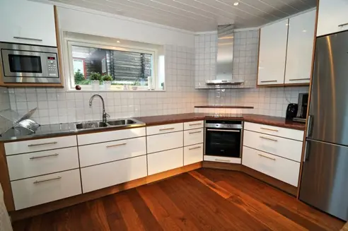Køkkenet indeholder: keramiske kogeplader med ovn, køleskab, frys, opvaskemaskine, microovn.